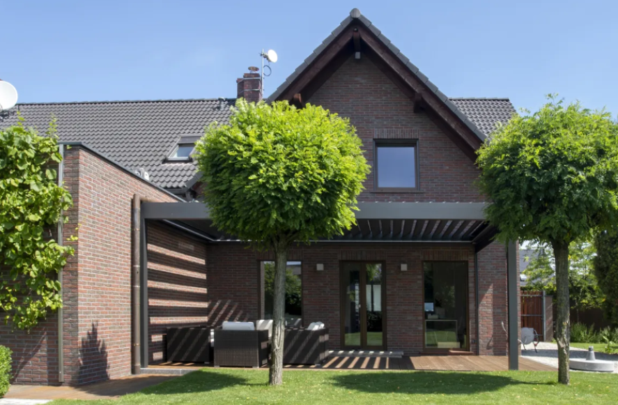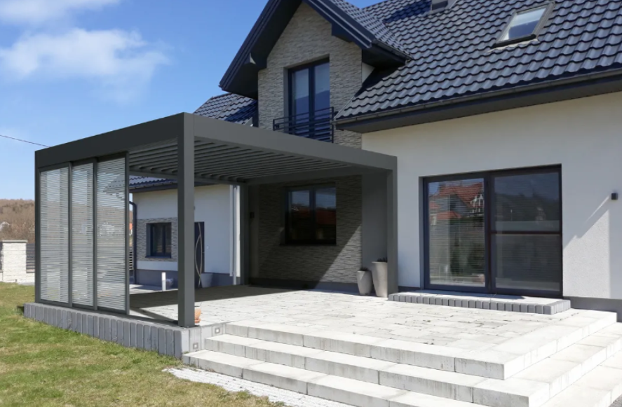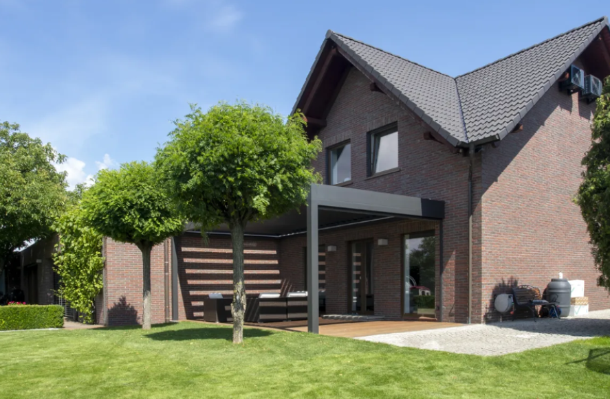 Bei Wandmontage wird die Pergola zu einer natürlichen Erweiterung des Wohnraums und dient nicht nur als Terrassenüberdachung, sondern ermöglicht auch die Beschattung des Gebäudeinneren.