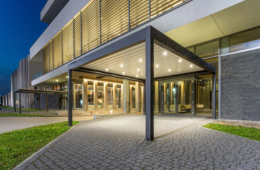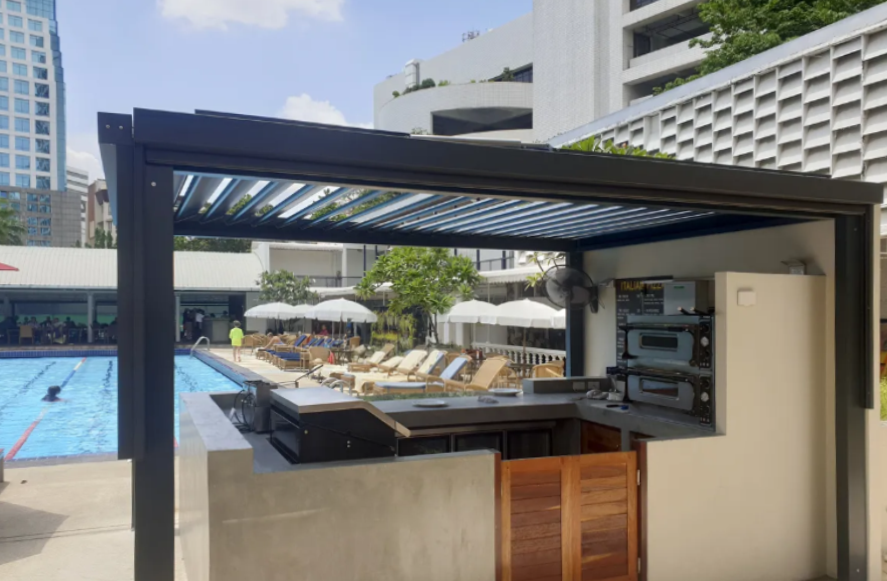Pergola ermöglicht sowohl die Bildung freistehender Einzelsysteme als auch von komplexen Mehrmodulkonstruktionen. Sie findet nicht nur in Gewerbebauten, sondern auch in Einfamilienhäusern Anwendung. Die Konstruktion besteht aus stranggepresstem Aluminium und rostfreien Stahlelementen und einem Dach aus beweglichen Lamellen mit variablem Neigungswinkel. Die Ausladung kann jeweils in Abständen von 25 cm ausgewählt werden. Die Lamellen begrenzen die Sonneneinstrahlung und ihre Neigung wird per Fernbedienung eingestellt. In geschlossener Position bilden Sie ein Dach, das die Terrasse ebenso vor Regenfall schützt. Das Wasser wird durch ein System aus integrierten Seitenrinnen und Abflüssen abgeleitet, die ästhetisch in der Konstruktion integriert sind.