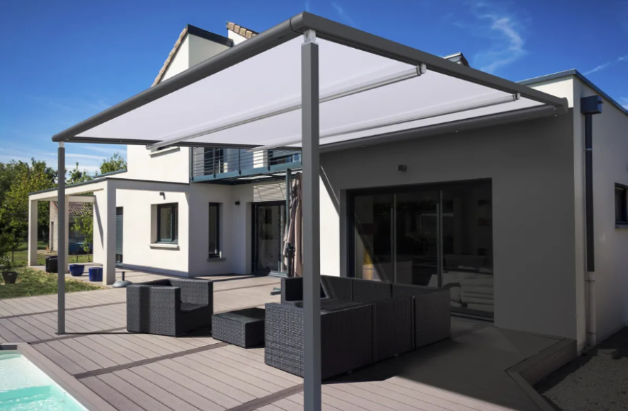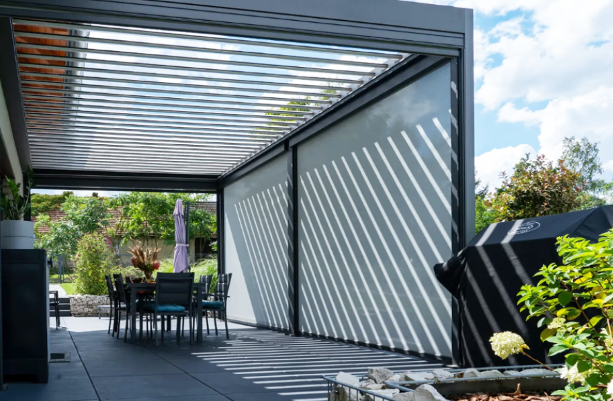 Pergolen können optional um Seitenschutzsysteme vom Typ Slide (Rahmeninhalt mit Serge-Stoff oder Aluminiumlamellen) oder ZIIIP-Refleksol erweitert werden, was ihre Funktionalität erhöht und die Einsatzmöglichkeiten erweitert.